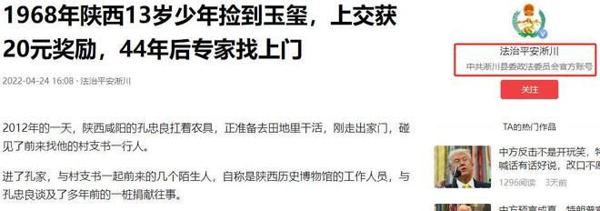 参考:法治平安淅川《1968年陕西13岁少年捡到玉玺,上交获20元奖励,44年后专家找上门》2022-4-24